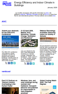 The January 2026 issue of the “Energy Efficiency and Indoor Climate in Buildings” newsletter has just been released. This monthly online newspaper contains relevant information on the Air Infiltration and Ventilation Centre (AIVC), the building and ductwork airtightness platform (TightVent Europe), the platform for resilient ventilative cooling (venticool), the Indoor Environmental Quality – Global Alliance (IEQ-GA), the Dynastee network & news from the EU and international partners.