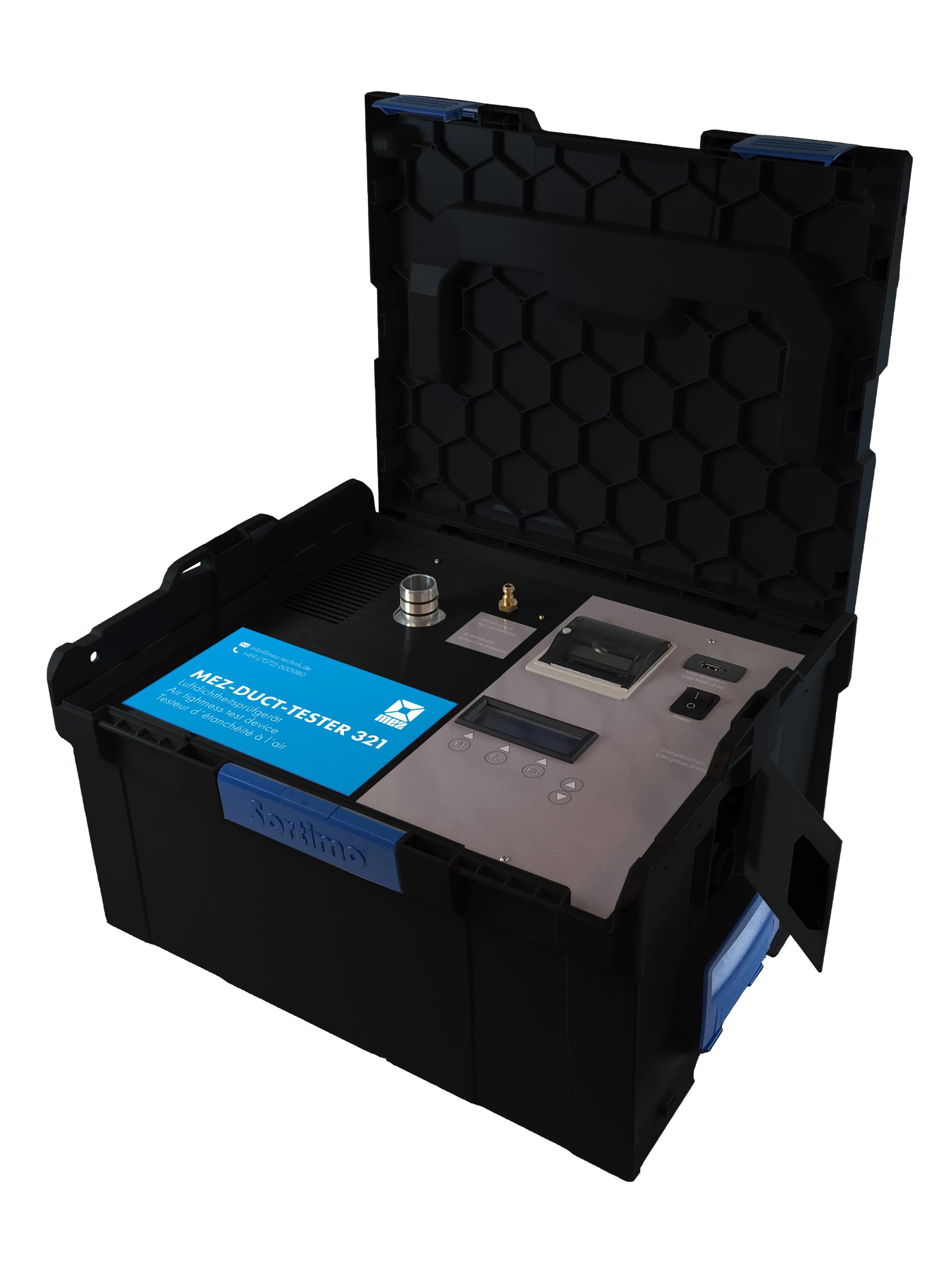 The new air tightness testing device MEZ DUCT TESTER 321 is used to determine the amount of air leakage and the air tightness class achieved in accordance with DIN EN 16798 3 or DIN EN 1507 and DIN EN 12237, especially in ventilation and air conditioning systems. An air tightness test on air handling systems is necessary to verify compliance with the required air tightness class and thus the air tightness of the duct system. Tighter air ducts enable energy savings. Furthermore, leaky systems can lead to hygienic impairments. Missing air volumes at the destination (due to leakages) can have a negative effect on the room conditions.