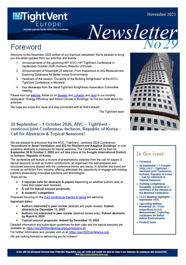 - 30 September – 1 October 2026, AIVC – TightVent – venticool joint Conference, Incheon, Republic of Korea – Call for Abstracts & Topical Sessions!