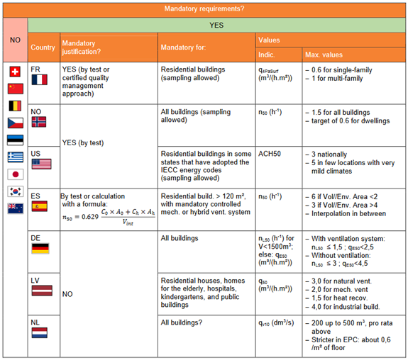 The required airtightness level for these countries are given in the table below, more details can be found in the AIVC Technical Note 73 [1] from which this table comes.